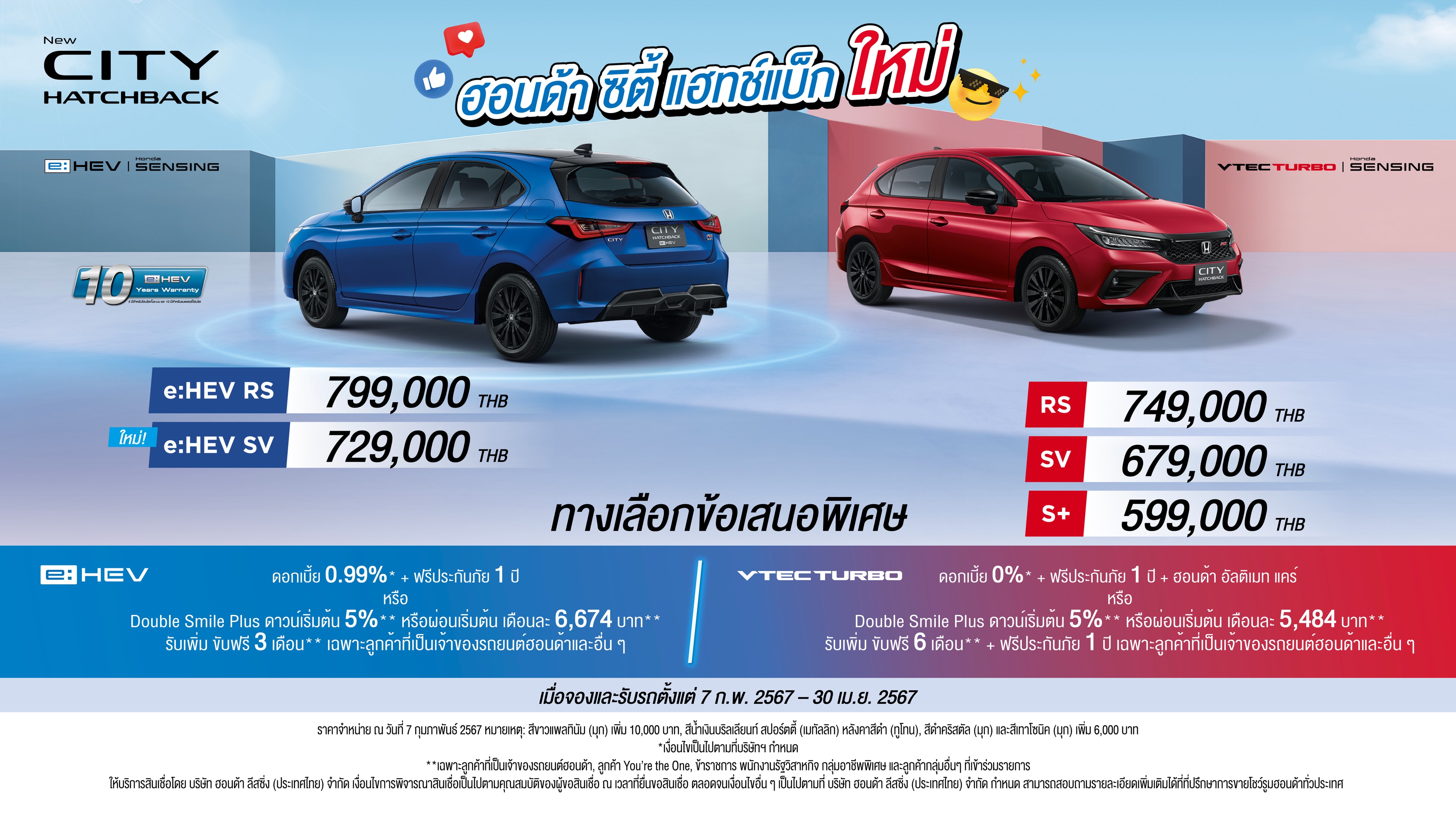 (กรุงเทพฯ – 7 กุมภาพันธ์ 2567) บริษัท ฮอนด้า ออโตโมบิล (ประเทศไทย) จำกัด เปิดตัว ฮอนด้า ซิตี้ แฮทช์แบ็ก ใหม่ มาพร้อมราคาพิเศษ ทั้งรุ่นระบบฟูลไฮบริด e:HEV ที่เข้าถึงง่ายขึ้นด้วยราคาใหม่ รุ่น e:HEV RS 799,000 บาท และเพิ่มรุ่นย่อย e:HEV SV ราคา 729,000 บาท พร้อมด้วยรุ่นขุมพลัง VTEC TURBO ที่เพิ่มฟังก์ชันการใช้งานและอัปเกรดความปลอดภัยอีกขั้นกับเทคโนโลยีความปลอดภัยอัจฉริยะ Honda SENSING ในทุกรุ่นย่อย ด้วยราคา 599,000 – 749,000 บาท พร้อมมอบข้อเสนอพิเศษ** อาทิ Double Smile Plus ขับฟรีสูงสุด 6 เดือน** ดาวน์เริ่มต้น 5% เพียง 29,950 บาท** หรือเลือกผ่อนเริ่มต้นเพียงเดือนละ 5,484 บาท** เพื่อให้ลูกค้าเป็นเจ้าของ ซิตี้ แฮทช์แบ็ก ใหม่ ได้ง่ายยิ่งขึ้น เสริมความมั่นใจในรุ่น e:HEV รับเพิ่มการรับประกันแบตเตอรี่ไฮบริด 10 ปี และรับประกันระบบไฮบริดทั้งระบบ 5 ปี ไม่จำกัดระยะทาง** เมื่อจองและรับรถตั้งแต่ 7 กุมภาพันธ์ 2567 – 30 เมษายน 2567 ดีไซน์ภายนอกของ ฮอนด้า ซิตี้ แฮทช์แบ็ก ใหม่ ปรับโฉมสปอร์ตใหม่รอบคัน โดดเด่นปราดเปรียวในสไตล์รถแฮทช์แบ็ก ภายในห้องโดยสารกว้างสบาย มาพร้อมเบาะนั่งอัลตราซีท (ULTR Seat) อันเป็นเอกลักษณ์ของฮอนด้า ที่สามารถปรับพับเพิ่มสเปซการใช้งานได้ดั่งใจ พร้อมเพิ่มฟังก์ชันการใช้งาน อาทิ ระบบเครื่องเสียงหน้าจอสัมผัสขนาด 8 นิ้ว แบบ Advanced Touch ที่เพิ่มการรองรับการเชื่อมต่อ Apple CarPlay และ Android Auto แบบไร้สาย* และใหม่! ช่องเชื่อมต่อ USB ด้านหลังแบบ Type-C 2 ตำแหน่ง* อีกทั้งหลากหลายเทคโนโลยีเพื่อความสะดวกสบาย ขับเคลื่อนสู่ทุกเส้นทางอย่างทรงพลังกับ 2 ขุมพลัง ทั้งระบบฟูลไฮบริดe:HEV ที่ผสานการทำงานร่วมกันของมอเตอร์ไฟฟ้า 2 ตัว กับเครื่องยนต์ขนาด 1.5 ลิตร 4 สูบ 16 วาล์ว พร้อมด้วยเกียร์ E-CVT และแบตเตอรี่ลิเธียม-ไอออน ตอบสนองดั่งใจด้วยแรงบิดมอเตอร์สูงสุด 253 นิวตัน-เมตร และให้อัตราการประหยัดน้ำมันดีเยี่ยมยิ่งขึ้นที่ 27.8 กม./ลิตร และขุมพลัง VTEC TURBO 1.0 ลิตร ขับสนุกทุกอัตราเร่งด้วยกำลังสูงสุด 122 แรงม้า พิเศษกับสีภายนอกน้ำเงิน บริลเลียนท์ สปอร์ตตี้ (เมทัลลิก) ที่มาพร้อมหลังคาสีดำแบบ Two-tone ใหม่ เฉพาะรุ่น e:HEV RS และ e:HEV SV พร้อมให้ลูกค้าได้สัมผัสและทดลองขับ ฮอนด้า ซิตี้ แฮทช์แบ็ก ใหม่ ได้ที่โชว์รูมฮอนด้าทั่วประเทศตั้งแต่ 7 กุมภาพันธ์ 2567 เป็นต้นไป