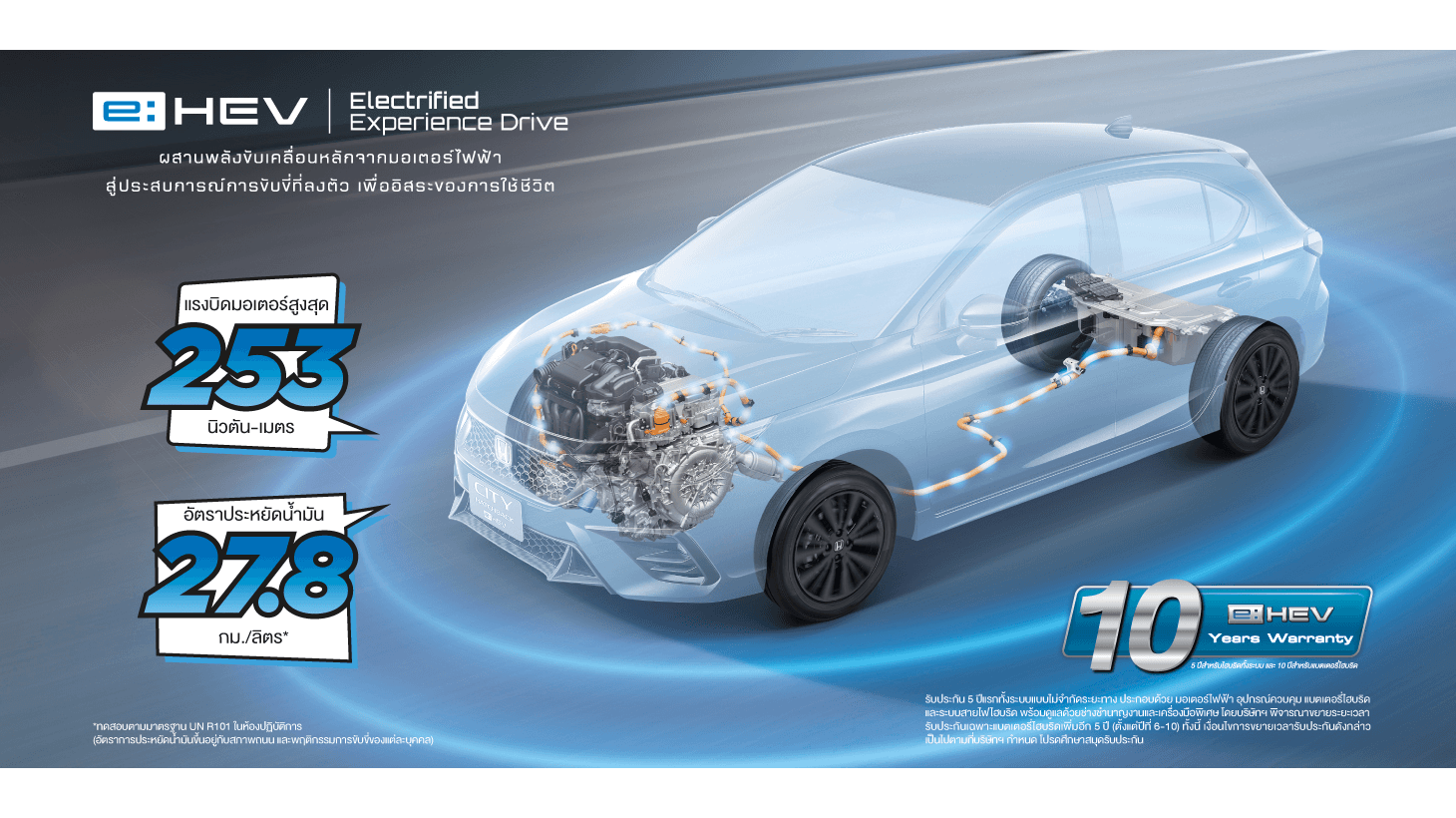 • ระบบขับเคลื่อนฟูลไฮบริด e:HEV ที่มอบสมรรถนะการขับขี่ทรงพลัง ตอบโจทย์ในทุกเส้นทางด้วยมอเตอร์ไฟฟ้า 2 ตัว ผสานการทำงานอันทรงพลังร่วมกันกับเครื่องยนต์ขนาด 1.5 ลิตร Atkinson Cycle DOHC i-VTEC 4 สูบ 16 วาล์ว พร้อมระบบเกียร์อัตโนมัติอัตราทดแปรผันต่อเนื่องไฟฟ้า (E-CVT) และแบตเตอรี่ลิเธียม-ไอออน มอบการตอบสนองได้ดั่งใจตั้งแต่ออกตัวกับแรงบิดมอเตอร์สูงสุด 253 นิวตัน-เมตร ที่ 0 - 3,000 รอบต่อนาที และประหยัดน้ำมันดีเยี่ยมยิ่งขึ้นที่ 27.8 กม./ลิตร มีอัตราการปล่อยก๊าซคาร์บอนไดออกไซด์เพียง 85 กรัม/กิโลเมตร และรองรับน้ำมัน E20 ทั้งนี้ ระบบฟูลไฮบริด e:HEV จะปรับเปลี่ยนโหมดการขับขี่ให้โดยอัตโนมัติตามความเหมาะสมและสถานการณ์การขับขี่ ประกอบด้วย 3 โหมด ได้แก่ โหมดการขับขี่ด้วยมอเตอร์ไฟฟ้า (EV Drive Mode) โหมดการขับขี่ด้วยระบบไฮบริด (Hybrid Drive Mode) และโหมดการขับขี่ด้วยเครื่องยนต์ (Engine Drive Mode)