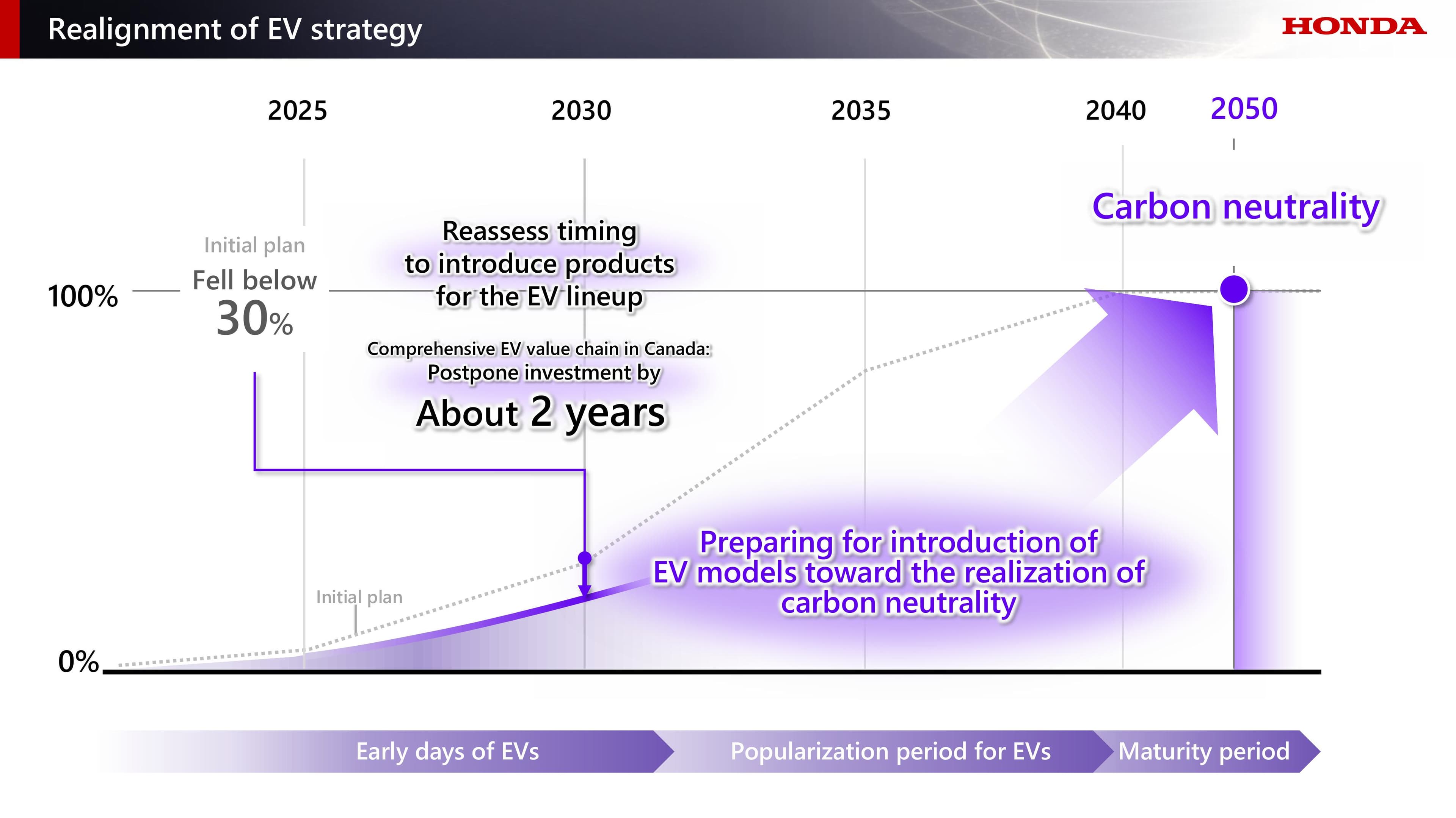 สำหรับแผนการลงทุนในกลยุทธ์ด้าน EV ที่ประกาศไว้เมื่อปีที่ผ่านมา ซึ่งมีมูลค่า 10 ล้านล้านเยนฮอนด้า ได้ปรับลดวงเงินลงทุนลง 3 ล้านล้านเยน เหลือ 7 ล้านล้านเยน ภายในปีงบประมาณ 2031 (ปีงบประมาณสิ้นสุดวันที่ 31 มีนาคม 2031) โดยเป็นผลจากการตัดสินใจเลื่อนโครงการสร้าง value chain สำหรับ EV แบบครบวงจรในประเทศแคนาดา รวมถึงการยืดเวลาในการสร้างโรงงานที่จะผลิต EV เฉพาะออกไปก่อน