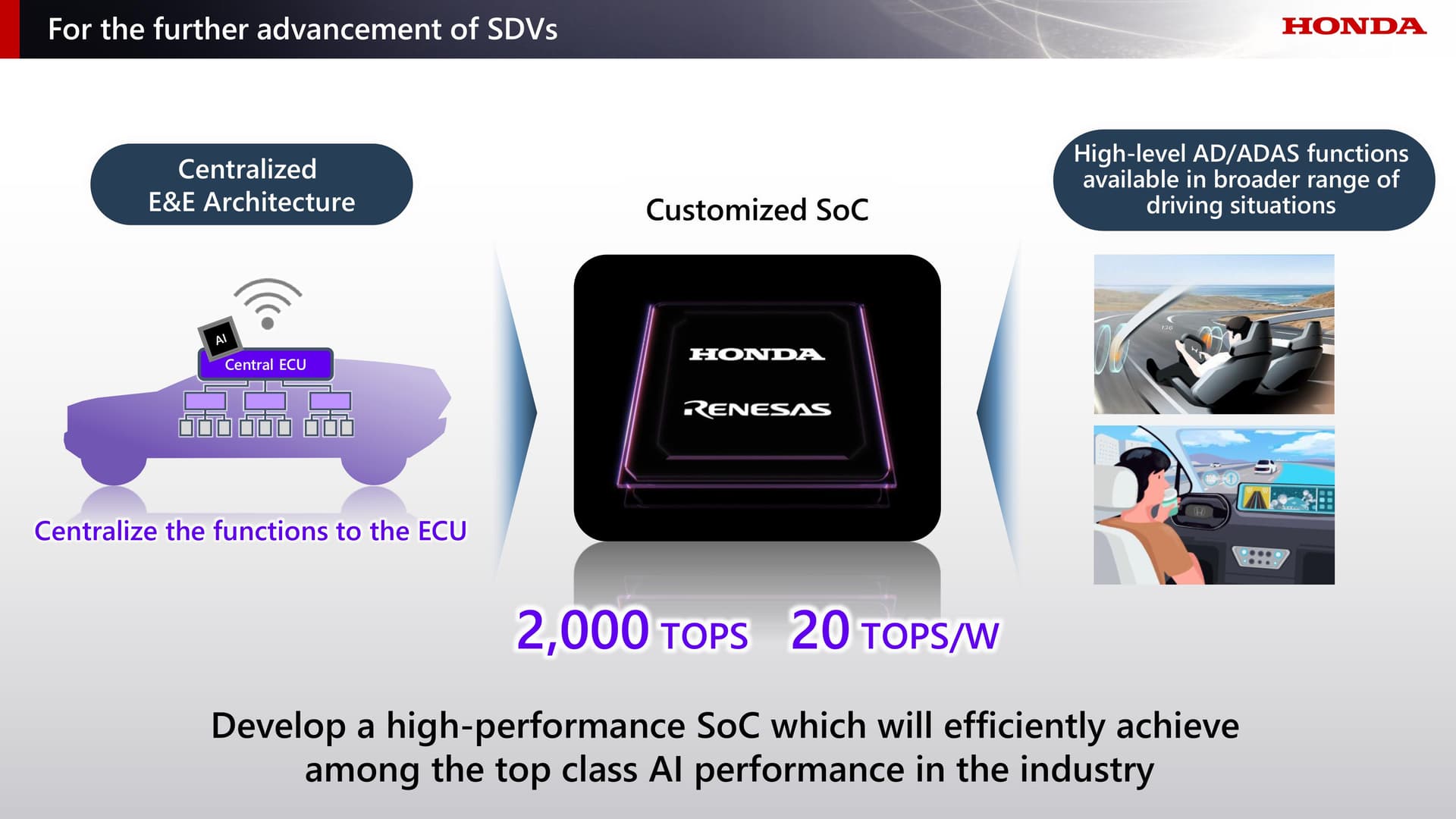 เพื่อก้าวเข้าสู่ยุคยานยนต์ไฟฟ้าอย่างเต็มรูปแบบในอนาคตสำหรับไลน์อัป Honda 0 Series (ฮอนด้า ซีโร่ ซีรีส์) ที่นับเป็นเสาหลักของธุรกิจ EV ของฮอนด้าในอนาคต จะมีการเผยโฉมรถยนต์รุ่นแรกในไลน์อัปในปีหน้า ซึ่งฮอนด้า จะส่งมอบคุณค่า SDV (Software-Defined Vehicle) ที่ปรับแต่งให้เหมาะสมกับผู้ใช้งานแต่ละคนผ่านฟังก์ชัน “ultra-personal optimization” ผ่านการทำงานร่วมกันของระบบปฏิบัติการยานยนต์ ASIMO OS และระบบช่วยเหลือผู้ขับขี่/ระบบช่วยเหลือผู้ขับขี่ขั้นสูง (AD/ADAS) ที่ได้นำเสนอไปในงาน CES 2025