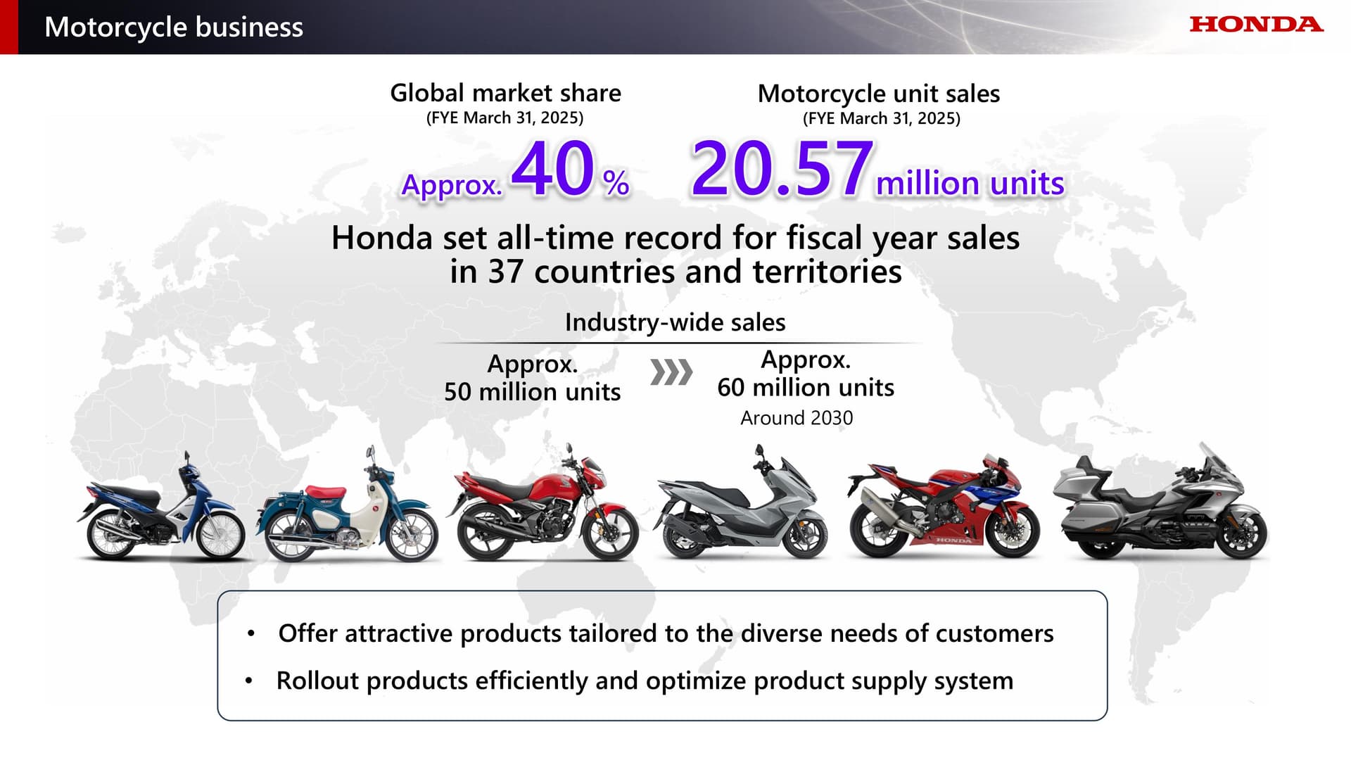 สำหรับปีงบประมาณล่าสุด ซึ่งสิ้นสุดลงเมื่อวันที่ 31 มีนาคม 2025 ที่ผ่านมา ฮอนด้า มียอดจำหน่ายรถจักรยานยนต์รวมทั้งสิ้น 20.57 ล้านคัน คิดเป็นสัดส่วนกว่า 40% ของยอดขายรวมในตลาดรถจักรยานยนต์ทั่วโลก โดยความสำเร็จครั้งนี้ยังสร้างสถิติยอดขายสูงสุดเป็นประวัติการณ์ใน 37 ประเทศและภูมิภาคอีกด้วย ทั้งนี้ คาดว่าความต้องการในตลาดรถจักรยานยนต์จะยังคงเติบโตอย่างต่อเนื่อง โดยเฉพาะในกลุ่มประเทศกำลังพัฒนา รวมถึงประเทศอินเดีย ซึ่งเป็นตลาดรถจักรยานยนต์ใหญ่ที่สุดในโลก อันเนื่องมาจากการขยายตัวของประชากรและระดับรายได้ที่เพิ่มสูงขึ้น โดยคาดการณ์ว่า ยอดขายรวมของอุตสาหกรรมจะเพิ่มขึ้นจากระดับปัจจุบันประมาณ 50 ล้านคัน เป็น 60 ล้านคันภายในปี 2030