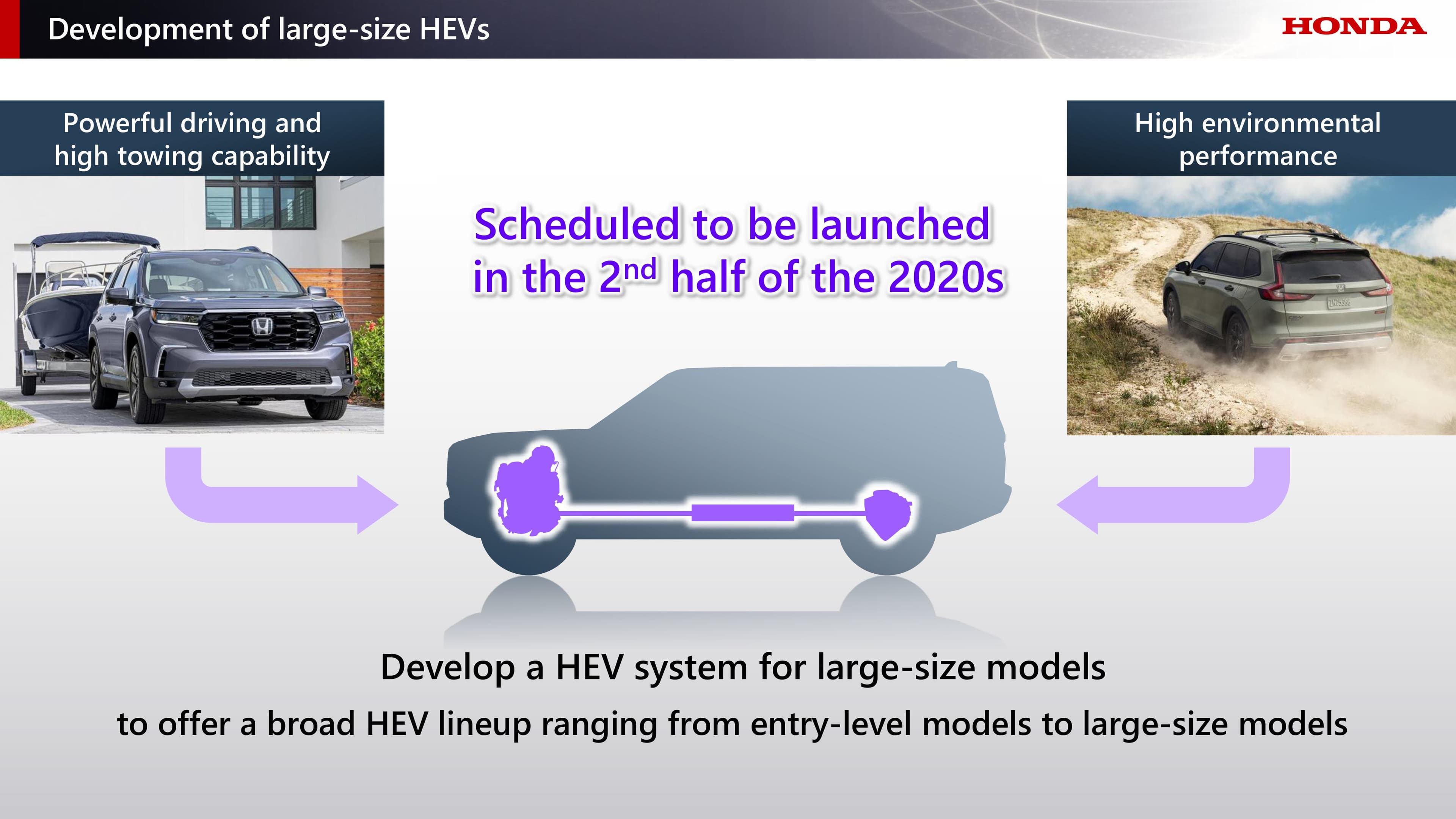 สำหรับตลาดอเมริกาเหนือที่เป็นตลาดหลักของรถไฮบริด (HEV) ฮอนด้า มีแผนที่จะพัฒนาระบบไฮบริดสำหรับรถขนาดใหญ่ เพื่อรองรับความต้องการของลูกค้าในตลาดนี้ โดยเตรียมที่จะติดตั้งในรถที่จะเปิดตัวในช่วงครึ่งปีหลังของทศวรรษ 2020