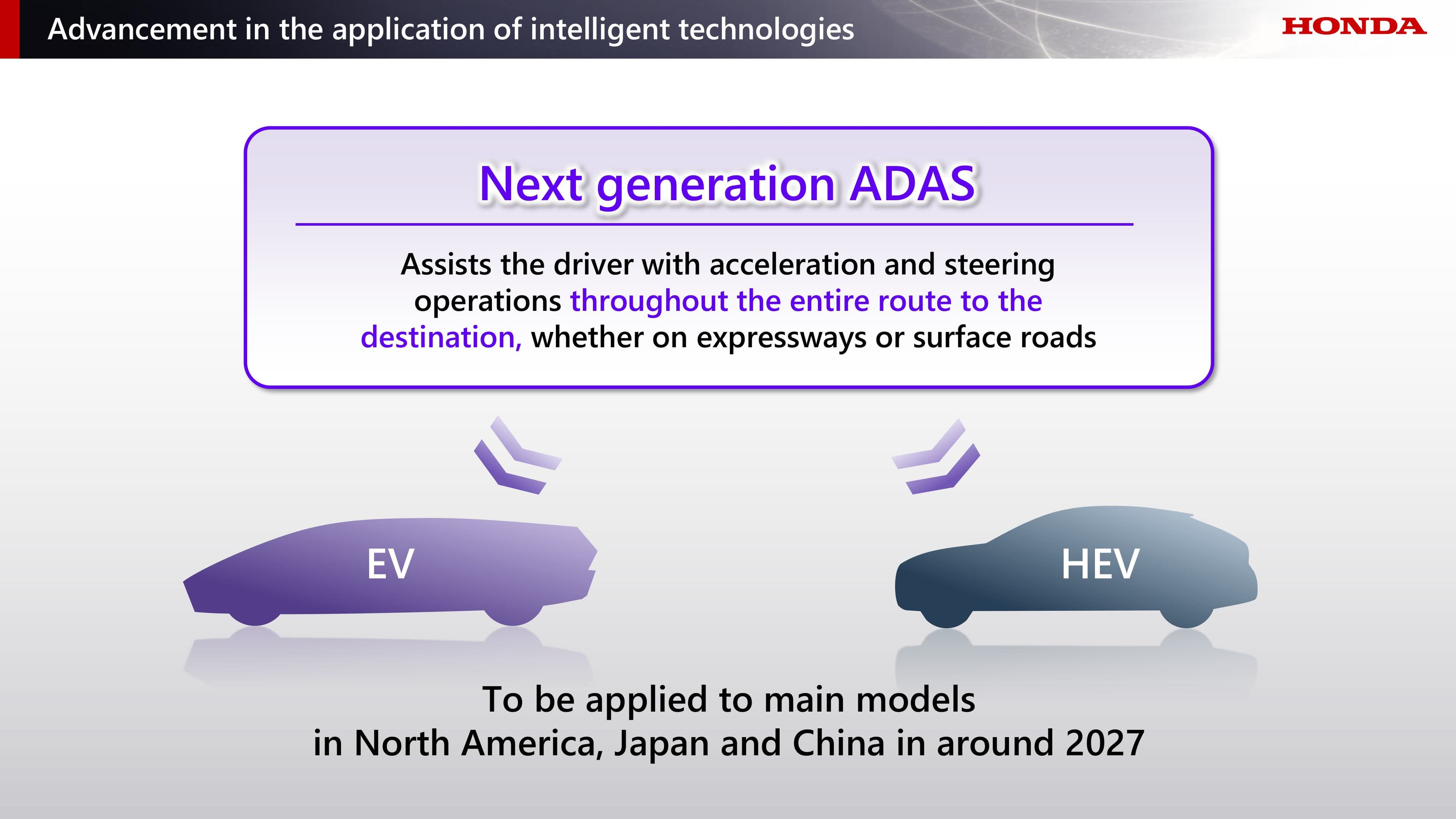 โดยฮอนด้ามีแผนในการติดตั้งระบบช่วยเหลือผู้ขับขี่ขั้นสูง (ADAS) เจเนอเรชันใหม่ ในรถยนต์ไฟฟ้า (EV) และรถไฮบริด (HEV) รุ่นหลัก ๆ ที่เตรียมเปิดตัวในอเมริกาเหนือและญี่ปุ่น ในปี 2027