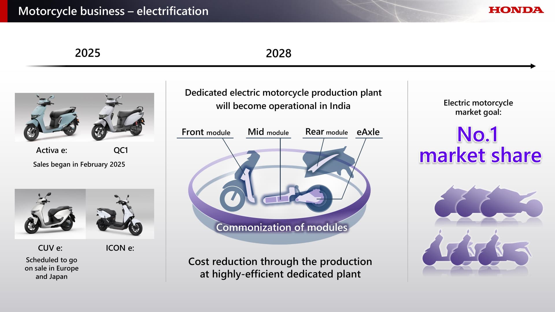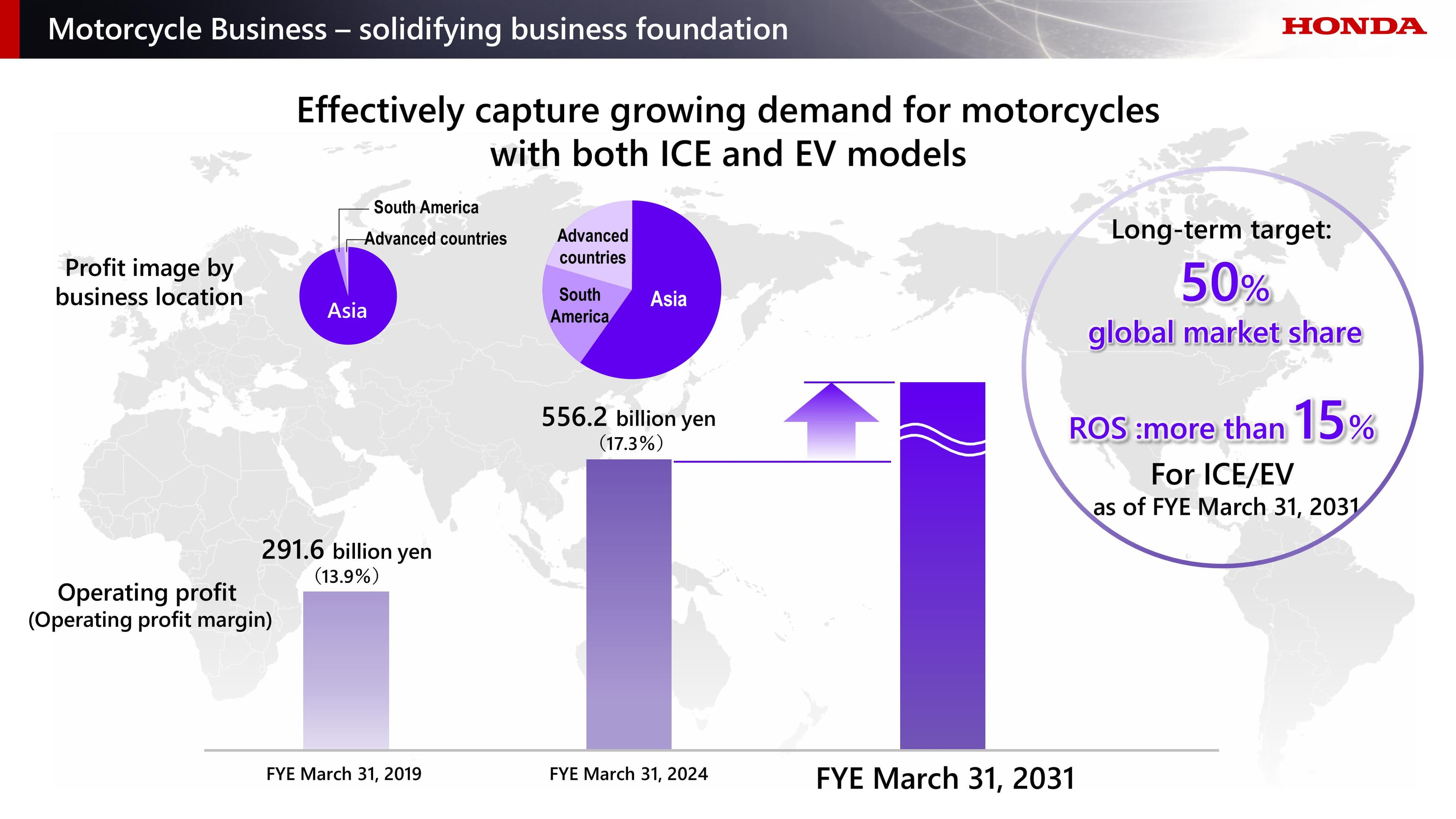 เมื่อดำเนินการเช่นนี้แล้ว ฮอนด้าจะสามารถรองรับความต้องการที่เพิ่มขึ้นได้อย่างมีประสิทธิภาพ ผ่านการเปิดตัวผลิตภัณฑ์ใหม่ที่มีความโดดเด่นและการพัฒนาระบบซัพพลายเชนที่ครอบคลุมทั้งในกลุ่มเครื่องยนต์สันดาป (ICE) และกลุ่มรถจักรยานยนต์ไฟฟ้า โดยในระยะยาว ฮอนด้าตั้งเป้าสร้างฐานธุรกิจที่มั่นคงด้วยส่วนแบ่งตลาดระดับโลกที่ 50% และอัตรากำไรจากการดำเนินงาน (ROS) มากกว่า 15% ภายในปีงบประมาณ 2531 (ซึ่งจะสิ้นสุดในวันที่ 31 มีนาคม 2031)
