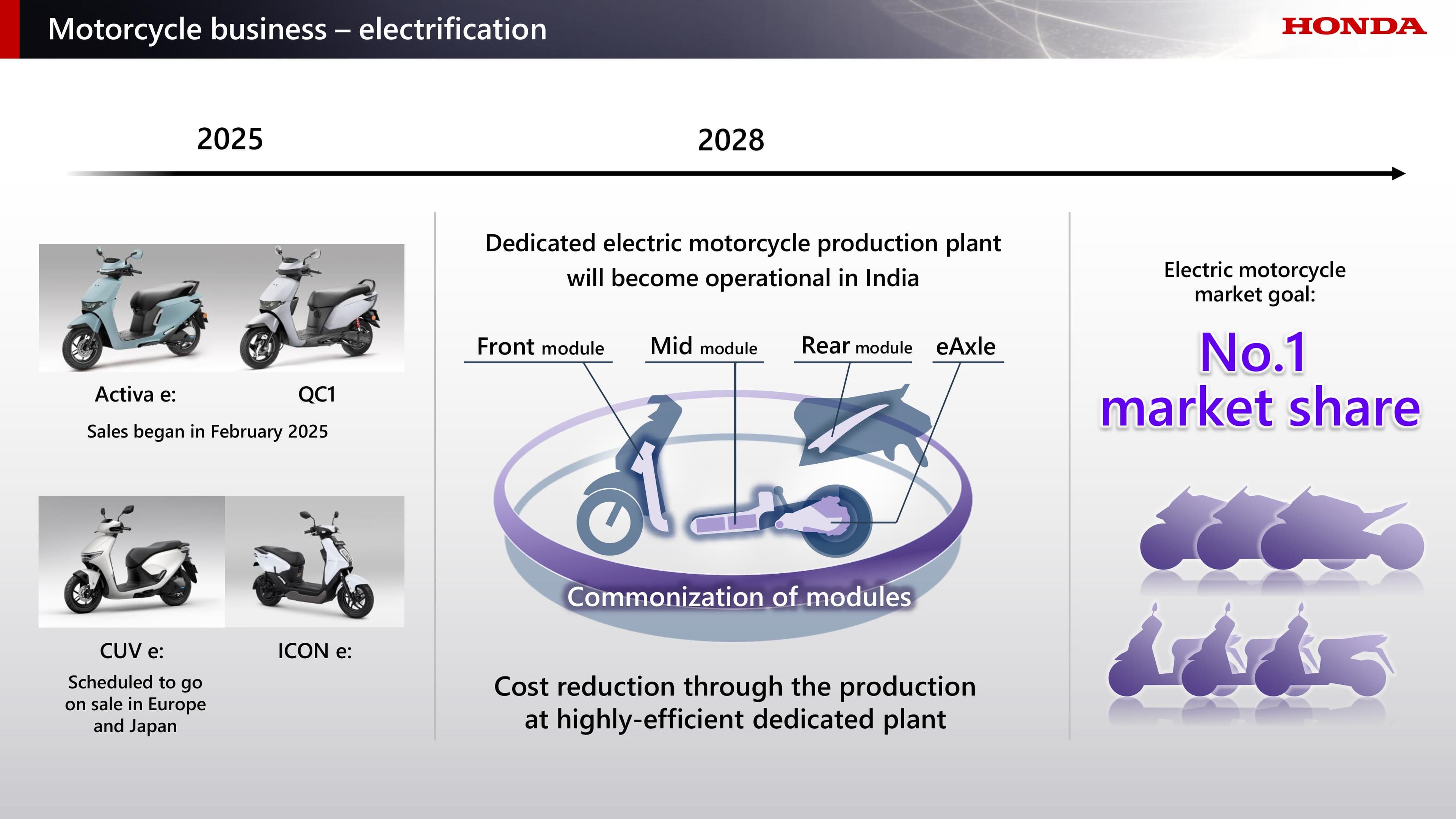 สำหรับรถจักรยานยนต์ไฟฟ้า ฮอนด้า ได้เริ่มวางจำหน่ายรุ่น Active e: และ QC1 ในเดือนกุมภาพันธ์ที่ผ่านมา โดยได้มีการเปิดตัวครั้งแรกในประเทศอินเดียเมื่อปีก่อน ขณะเดียวกัน ฮอนด้ายังได้เริ่มจำหน่ายรถจักรยานยนต์ไฟฟ้าระดับโลก อย่างรุ่น CUV e: และ ICON e: ในประเทศอินโดนีเซียเป็นแห่งแรก และมีแผนขยายตลาดต่อไปยังเวียดนาม ไทย และฟิลิปปินส์