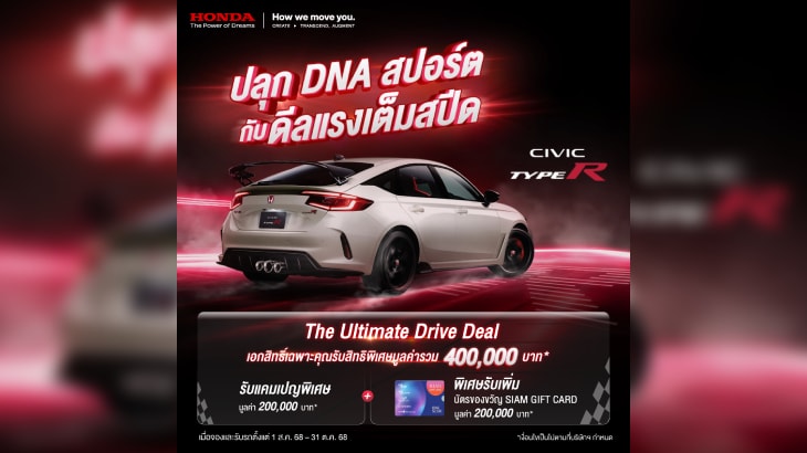 บริษัท ฮอนด้า ออโตโมบิล (ประเทศไทย) จำกัด ส่งดีลแรงเต็มสปีด เอาใจแแฟน ๆ สายสปอร์ตกับแคมเปญ "The Ultimate Drive Deal" ให้คุณเป็นเจ้าของ ฮอนด้า ซีวิค ไทป์ อาร์ (Civic Type R) ที่สุดแห่งยนตรกรรมความสปอร์ต กับข้อเสนอสุดพิเศษรวมมูลค่า 400,000 บาท เมื่อจองและรับรถระหว่างวันที่ 1 สิงหาคม 2568 – 31 ตุลาคม 2568