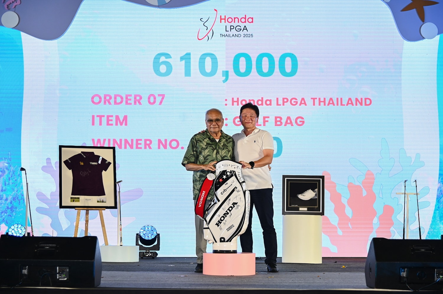 ภายในงานอบอวลไปด้วยบรรยากาศแห่งความอบอุ่นที่เกิดจากธารน้ำใจแห่งการให้ หนึ่งในไฮไลต์สำคัญของการประมูล ได้แก่ ถุงกอล์ฟฮอนด้าสุดเอ็กซ์คลูซีฟ พร้อมลายเซ็นจากนักกอล์ฟทั้ง 72 คนที่เข้าร่วมการแข่งขัน ฮอนด้า แอลพีจีเอ ไทยแลนด์ 2025 ซึ่งได้ถูกประมูลไปในราคา 610,000 บาท โดย ดร.ปราจิน เอี่ยมลำเนา ประธานกรรมการบริหารและประธานเจ้าหน้าที่บริหาร บริษัท กรังด์ปรีซ์ อินเตอร์เนชั่นแนล จำกัด (มหาชน)