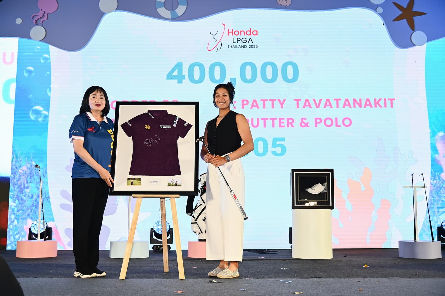 ส่วนไอเทมอีกหนึ่งชิ้นที่ได้รับความสนใจเป็นอย่างมากคือ พัตเตอร์และเสื้อกอล์ฟของ แพตตี้-ปภังกร ธวัชธนกิจ แชมป์ ฮอนด้า แอลพีจีเอ ไทยแลนด์ 2024 ซึ่งถูกประมูลไปในราคา 400,000 บาท โดย คุณวัชรินทร์ ล่องดุริยางค์ ประธาน บริษัท ฮอนด้า ปิยะ จำกัด