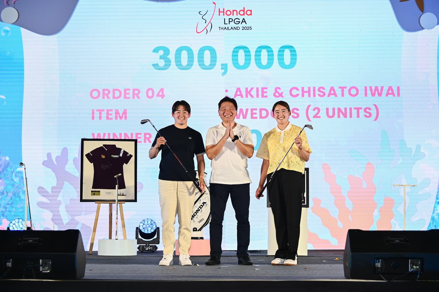 ส่วนเวดจ์ของพี่น้องคู่แฝดจากญี่ปุ่น ชิซาโตะ อิวาอิ มืออันดับ 52 ของโลก และ อากิเอะ อิวาอิ มืออันดับ 33 ของโลกได้ผู้ชนะการประมูล คือ มร. โทชิโอะ คุวาฮาระ ประธานกรรมการบริหารและซีอีโอ บริษัท เอเชี่ยนฮอนด้ามอเตอร์ จำกัด ประมูลไปในราคา 300,000 บาท และ รองเท้ากอล์ฟของ ซีลีน บูติเยร์ มืออันดับ 9 ของโลกจากฝรั่งเศสสายเลือดไทย ได้รับการประมูลไปในราคา 210,000 บาท โดย มร. ยูอิจิ ชิมิซุ ประธานกรรมการบริหาร บริษัท ไทยฮอนด้า จำกัด