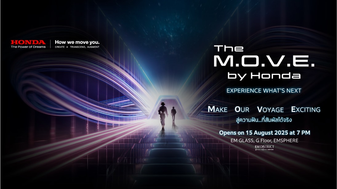 The M.O.V.E. by Honda ถือเป็นอีกก้าวสำคัญของฮอนด้า ในการเดินหน้าสู่อนาคตที่ขับเคลื่อนด้วยพลังงานไฟฟ้าและอนาคตของความยั่งยืน ฮอนด้าขอเชิญชวนลูกค้า ผู้หลงใหลในนวัตกรรม และประชาชนทั่วไปมาร่วมเปิดประสบการณ์ใหม่ที่ศูนย์การค้า EMSPHERE กับอิมเมอร์ซีฟ เอ็กซ์พีเรียนซ์ เซ็นเตอร์แห่งแรกของฮอนด้าที่จะพาไปสัมผัสมิติใหม่ของการเดินทางอย่างที่ ไม่เคยมีมาก่อนผ่านนิทรรศการสุดล้ำ พร้อมเข้าถึงแนวคิด Sense the Synergy ซึ่งเป็นวิสัยทัศน์แห่งอนาคตของฮอนด้าอย่างเต็มรูปแบบ