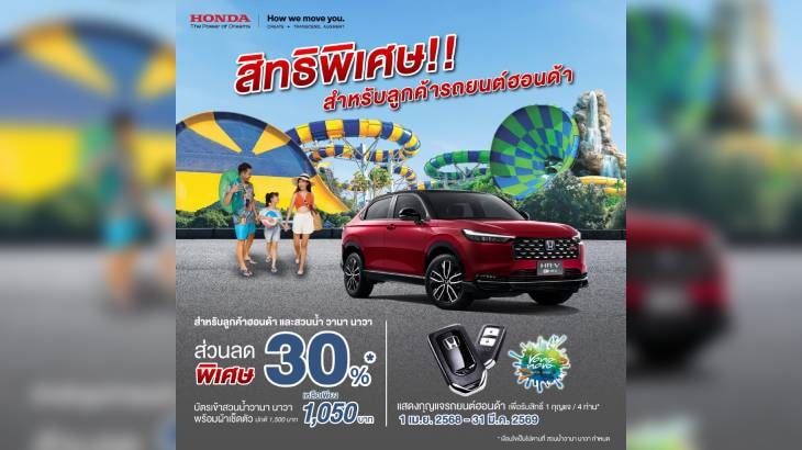 บริษัท ฮอนด้า ออโตโมบิล (ประเทศไทย) จำกัด มอบสิทธิพิเศษสุดคุ้ม ให้กับลูกค้าครอบครัวฮอนด้าทุกท่าน จัดเต็มส่วนลด 30% เพียงโชว์กุญแจรถยนต์ฮอนด้ารุ่นใดก็ได้ สาหรับบัตรเข้าสวนน้า วานา นาวา หัวหิน (Vana Nava Hua Hin) โดยราคาบัตรผู้ใหญ่พร้อมผ้าเช็ดตัว จากปกติราคา 1,500 บาท ลดเหลือเพียง 1,050 บาท ที่จุดจาหน่ายบัตรหน้าสวนน้า (1 กุญแจ ต่อ 4 สิทธิ์ ต่อวัน) ลูกค้าสามารถรับสิทธิ์ผ่านโปรโมชันนี้ได้ ตั้งแต่วันที่ 1 เมษายน 2568 - 31 มีนาคม 2569