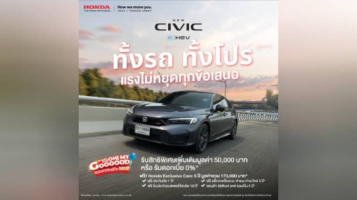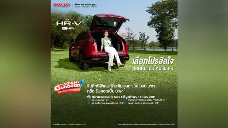 (กรุงเทพฯ – 13 พฤศจิกายน 2568) บริษัท ฮอนด้า ออโตโมบิล (ประเทศไทย) จำกัด จัดโปรแรงส่งท้ายปีกับแคมเปญ “Honda Pro OH! MY GOOOOOD PLUS+” เพิ่มเติมทางเลือกใหม่สำหรับรถยนต์สองรุ่นฮิตในไลน์อัป Honda e:HEV – The EXCITING Hybrid ทั้ง Honda Civic e:HEV และ New Honda HR-V e:HEV มอบความคุ้มค่าที่ “ตรงใจ เลือกได้เอง” ให้คุณเลือกได้ดั่งใจรับสิทธิพิเศษเพิ่มเติมมูลค่า 50,000 บาท หรือ เลือกรับดอกเบี้ยพิเศษ 0% พร้อมรับ Honda Exclusive Care 5 ปี มูลค่าสูงสุด 173,000 บาท** ให้การเป็นเจ้าของรถยนต์ทั้งสองรุ่นเป็นเรื่องง่ายกว่าที่เคย สำหรับลูกค้าที่จองรถยนต์ตั้งแต่วันที่ 1 พฤศจิกายน 2568 – 11 ธันวาคม 2568 และรับรถภายในวันที่ 31 ธันวาคม 2568 อย่าพลาด! โปรแรงแห่งปีที่ทำให้ความฝันของคุณเป็นจริง