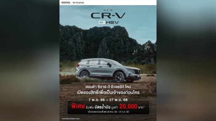 ให้ลูกค้าได้สัมผัสกับ SUV ไฮบริดสำหรับครอบครัวที่ครบและคุ้มค่าในราคาที่เข้าถึงง่ายยิ่งขึ้น ด้วยราคาประมาณการเริ่มต้นไม่เกิน 1,4XX,XXX บาท* จัดเต็มความคุ้มค่าด้วยฟีเจอร์ใหม่! อาทิ ระบบช่วยเตือนมุมอับสายตาที่กระจกมองข้าง (Blind Spot Information - BSI) ระบบเตือนเมื่อมีรถเคลื่อนผ่านขณะถอย (Cross Traffic Monitor - CTM) และแอปและบริการของ Google ที่ติดตั้งมาในตัว พร้อมทั้งอัปเกรดฟังก์ชันการใช้งานเพิ่มเติมในหลากหลายรุ่น** ครั้งแรก! กับรุ่นย่อยใหม่ e:HEV HuNT กับดีไซน์อัปลุคสะท้อนไวบ์ที่แตกต่างอีกขั้น และรุ่นย่อย e:HEV RS ที่มาพร้อมระบบขับเคลื่อน 2 ล้อ เพื่อตอบโจทย์ทุกความต้องการลูกค้าอย่างลงตัว พิเศษ! รับฟรีบัตรเติมน้ำมันมูลค่า 20,000 บาท*** พร้อมรับดอกเบี้ย 0.99%*** และฟรีประกันภัย 1 ปี สำหรับลูกค้าที่ลงทะเบียนจองสิทธิ์ล่วงหน้าเพื่อเป็นเจ้าของ Honda CR-V e:HEV ใหม่ ผ่านทางที่ปรึกษาการขายฮอนด้าที่โชว์รูมฮอนด้าทั่วประเทศ ตั้งแต่วันที่ 7 พฤศจิกายน 2568 – 27 พฤศจิกายน 2568