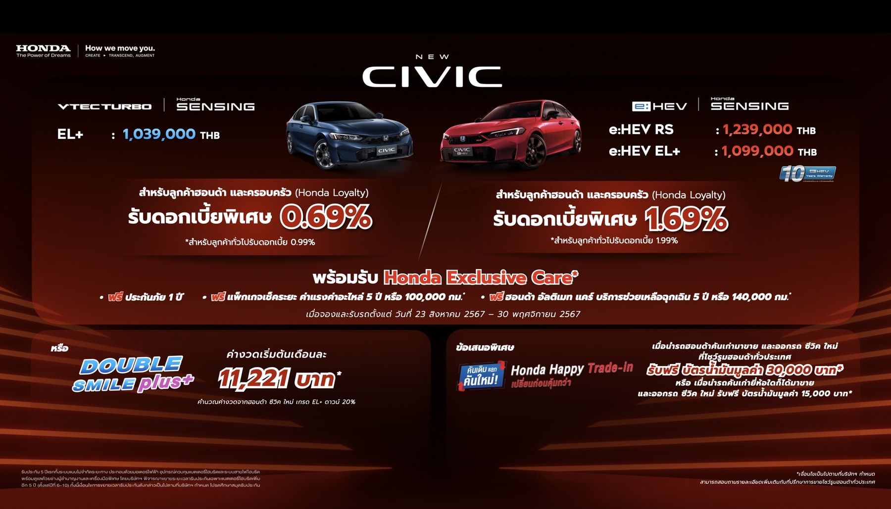 ดอกเบี้ยพิเศษเริ่มต้น 0.99%*** พร้อมรับ ฮอนด้า เอ็กซ์คลูซีฟ แคร์*** ได้แก่ ฟรีประกันภัย 1 ปี ฟรีแพ็กเกจเช็กระยะ ค่าแรง และค่าอะไหล่ตามตารางการบำรุงรักษา 5 ปี หรือ 100,000 กิโลเมตร (อย่างใดอย่างหนึ่งถึงก่อน) ฟรีฮอนด้า อัลติเมท แคร์ ขยายเวลารับประกันคุณภาพรถยนต์ใหม่และบริการช่วยเหลือฉุกเฉินนอกสถานที่ 24 ชั่วโมง อีก 2 ปี หรือ 40,000 กิโลเมตร รวมเป็น 5 ปี หรือ 140,000 กิโลเมตร (อย่างใดอย่างหนึ่งถึงก่อน) พิเศษ เฉพาะรุ่น e:HEV เท่านั้น เสริมความมั่นใจยิ่งขึ้นด้วยการรับประกันอายุการใช้งานแบตเตอรี่ไฮบริดถึง 10 ปี และรับประกันระบบไฮบริดทั้งระบบ 5 ปี ไม่จำกัดระยะทาง