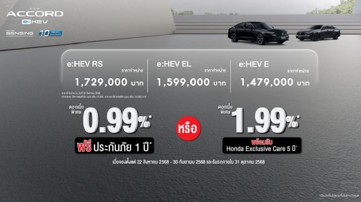 - เพิ่มเติม Happy Trade-in สำหรับ Honda Accord e:HEV รุ่น E เมื่อนำรถยนต์คันเดิมมาขายและออกรถยนต์ Honda Accord e:HEV รุ่น E ที่โชว์รูมฮอนด้า รับสิทธิพิเศษเพิ่มเติม มูลค่า 40,000 บาท*** (เมื่อจองตั้งแต่วันที่ 1 กรกฎาคม 2568 – 31 สิงหาคม 2568 และรับรถภายในวันที่ 30 กันยายน 2568)