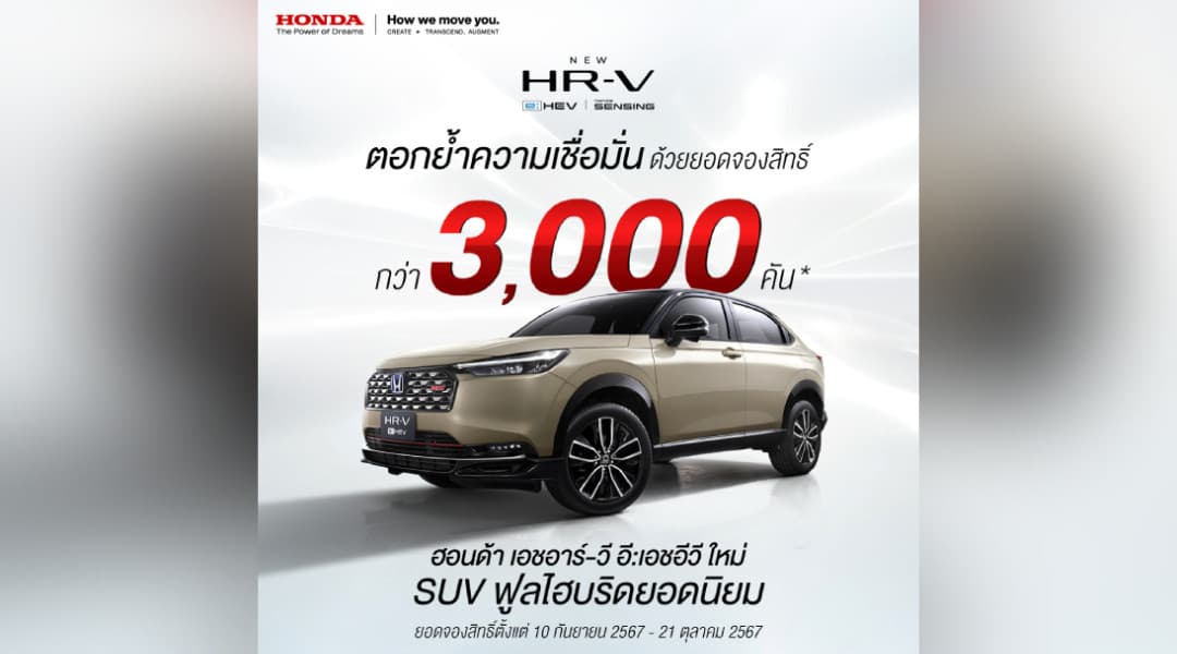 บริษัท ฮอนด้า ออโตโมบิล (ประเทศไทย) จำกัด ขอบคุณความเชื่อมั่นจากลูกค้าที่มีต่อ ฮอนด้า เอชอาร์-วี อี:เอชอีวี ใหม่ รุ่นไมเนอร์เชนจ์ ด้วยยอดจองสิทธิ์กว่า 3,000 คัน ตั้งแต่ 10 กันยายน 2567 – 21 ตุลาคม 2567 ตอกย้ำความเป็นรถ SUV ฟูลไฮบริดยอดนิยมจากฮอนด้าในใจลูกค้าชาวไทย ทั้งนี้ ฮอนด้า มุ่งหวังที่จะขยายฐานลูกค้าไปหลากหลายกลุ่มให้มากขึ้น ครั้งนี้ ฮอนด้า เอชอาร์-วี อี:เอชอีวี ใหม่ จึงมาพร้อมราคาแนะนำใหม่ เพื่อให้เป็นเจ้าของได้ง่ายขึ้น โดยหลังจากที่ได้ประกาศราคาประมาณการไปเมื่อวันที่ 3 ตุลาคม 2567 ที่ผ่านมา มีลูกค้าให้ความสนใจลงทะเบียนจองสิทธิ์ในการเป็นเจ้าของเพิ่มขึ้นอย่างต่อเนื่อง