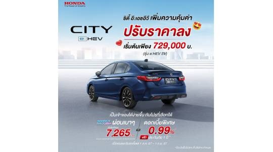 บริษัท ฮอนด้า ออโตโมบิล (ประเทศไทย) จำกัด ตอกย้ำความนิยมของตลาดxEV และกระแสตอบรับที่ดีจากลูกค้าชาวไทย มอบความคุ้มค่าในการเป็นเจ้าของยนตรกรรมฟูลไฮบริด e:HEV ได้ง่ายขึ้น ปรับราคาใหม่ สำหรับ ฮอนด้า ซิตี้ อี:เอชอีวี ลงทุกรุ่นย่อย โดยรุ่น e:HEV SV ราคา 729,000 บาท และรุ่น e:HEV RS 799,000 บาท ดีไซน์สปอร์ตพรีเมียมรอบคัน ภายในห้องโดยสารกว้างขวางสะดวกสบาย พร้อมฟังก์ชันการใช้งานที่รองรับไลฟ์สไตล์หลากหลายของคนยุคใหม่ มาพร้อมระบบฟูลไฮบริด e:HEV ผสานพลังขับเคลื่อนหลักจากมอเตอร์ไฟฟ้าทำงานร่วมกับเครื่องยนต์ มอบสมรรถนะการขับขี่ที่ทรงพลังให้ทั้งอัตราเร่งแรงเร้าใจ และอัตราการประหยัดน้ำมันที่ดีเยี่ยม พร้อมพาคุณเดินทางสู่ทุกจุดหมายและไปได้ไกลกว่า 800 กิโลเมตร ด้วยน้ำมันเพียง 1 ถัง* มั่นใจทุกการเดินทางด้วยเทคโนโลยีความปลอดภัยอัจฉริยะ Honda SENSING ที่มาพร้อมระบบปรับความเร็วตามรถยนต์คันหน้าที่ความเร็วต่ำ (with Low-Speed Follow: with LSF) เฉพาะรุ่น e:HEV SV และ e:HEV RS อีกทั้งหลากหลายเทคโนโลยีเพื่อความปลอดภัยและความสะดวกสบายในการขับขี่** อาทิ ระบบแสดงภาพมุมอับสายตาขณะเปลี่ยนเลน (Honda LaneWatch) ระบบล็อกรถอัตโนมัติเมื่อกุญแจรีโมทอยู่ห่างจากตัวรถ (Walk Away Auto Lock) ถุงลม 6 ตำแหน่ง ระบบเบรกมือไฟฟ้า (Electric Parking Brake) ระบบ Auto Brake Hold ไฟเตือนเบาะนั่งด้านหลัง (Rear Seat Reminder) ระบบเครื่องเสียงหน้าจอสัมผัสขนาด 8 นิ้ว แบบ Advanced Touch รองรับการเชื่อมต่อ Apple CarPlay และ Android Auto แบบไร้สาย ช่องเชื่อมต่อ USB ด้านหลังแบบ Type-C 2 ตำแหน่ง ระบบสตาร์ทเครื่องยนต์พร้อมเครื่องปรับอากาศด้วยกุญแจรีโมท (Remote Engine Start)