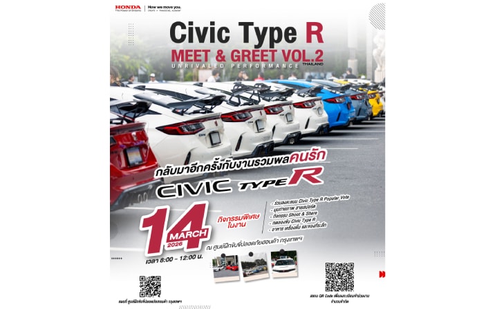 (กรุงเทพฯ – 25 กุมภาพันธ์ 2569) บริษัท ฮอนด้า ออโตโมบิล (ประเทศไทย) จำกัด จัดงานรวมตัวครั้งยิ่งใหญ่ของชาวแฟน ๆ สายสปอร์ตคนรัก Honda Civic Type R ในกิจกรรม Honda Civic Type R Fan Meet #2: The Unrivaled Performance ในวันเสาร์ที่ 14 มีนาคม 2569 ณ ศูนย์ฝึกขับขี่ปลอดภัยฮอนด้า ถนนรามคำแหง พร้อมเปิดรับสมัคร