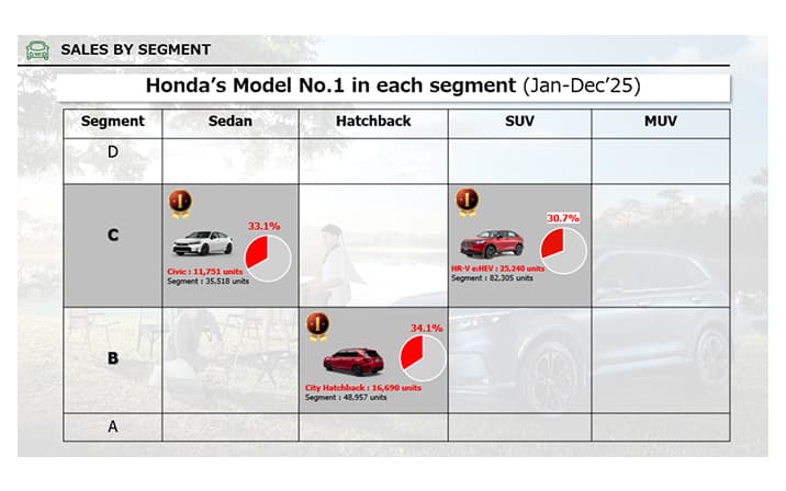 ท่ามกลางความท้าทายทางเศรษฐกิจ ฮอนด้ายังคงได้รับความไว้วางใจจากผู้บริโภคชาวไทย โดยมียอดจำหน่ายรถยนต์สะสมปี 2568 รวม 74,044 คัน (นับรวมกลุ่มรถยนต์อเนกประสงค์ของฮอนด้า) ครองอันดับ 2 ในตลาด ครองส่วนแบ่งทางการตลาดรถยนต์นั่งที่ 18% และมียอดจำหน่ายกลุ่มยานยนต์ไฟฟ้า (xEV) ในตลาดรถยนต์ สูงถึง 55,495 คัน ครองส่วนแบ่งทางการตลาดราว 20% ซึ่งยอดจำหน่ายหลักมาจากรถยนต์ในไลน์อัป e:HEV - The EXCITING Hybrid  ทั้งนี้ ฮอนด้า ยังสามารถครองอันดับ 1 ใน 3 เซกเมนต์หลักของตลาดรถยนต์นั่ง ได้แก่