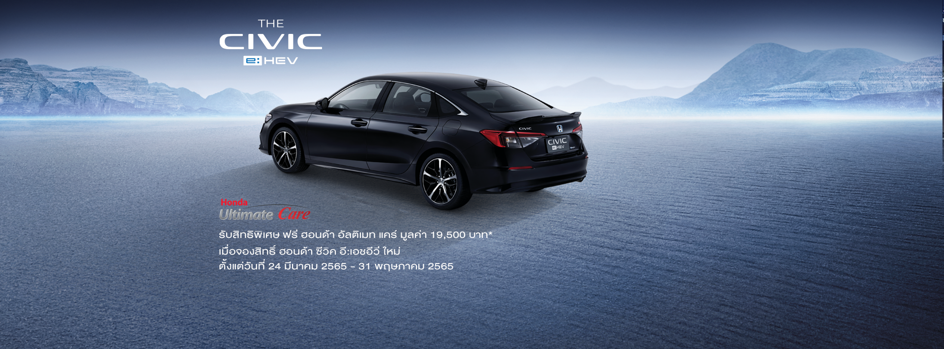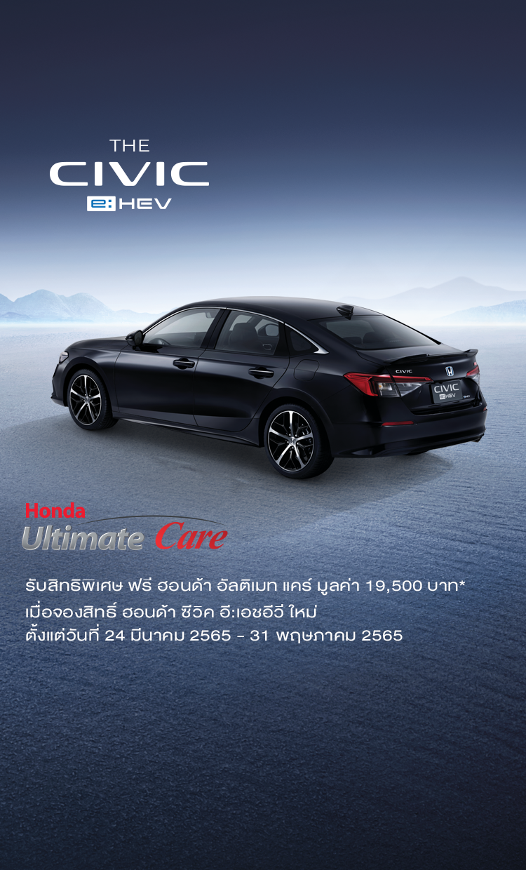 ● สิทธิพิเศษสำหรับลูกค้าจองสิทธิ์ ฮอนด้า ซีวิค อี:เอชอีวี ใหม่ รุ่น e:HEV RS และ e:HEV EL+ ตั้งแต่วันที่ 24 มีนาคม 2565 เวลา 10.00 น.-31พฤษภาคม 2565 เวลา 22.00 น.โดยสามารถจองสิทธิ์ผ่านที่ปรึกษาการขายฮอนด้า หรือที่โชว์รูมฮอนด้าทั่วประเทศ